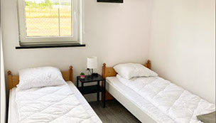 Sypialni numer 2, w której znajdują się 2 oddzielne łóżka, lamka i szafka nocna oraz 2